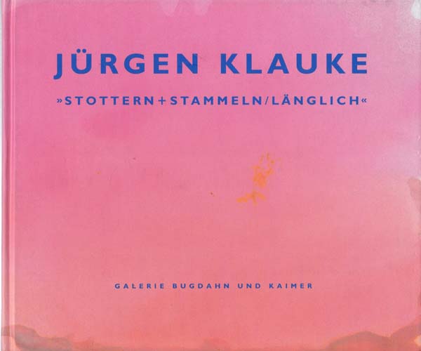Klauke, Jürgen: Stottern + Stammeln/ Länglich. Auflage 600 Exemplare. Düsseldorf. Galerie Bugdahn und Kaimer. 1994. 21 x 24 cm. 71 S. Illustrierter OPappband. Einbandkanten mit kleinen Bereibungen. Gutes bis sehr gutes Exemplar. Katalog zur Ausstellung Düsseldorf 1994 durchgehend mit Abbildungen sowie einem Textbeitrag von Norbert Jocks versehen, Hier die Nummer 49 von 600 Exemplaren mit eigenhändiger Signatur des Künstlers auf dem Titelblatt.