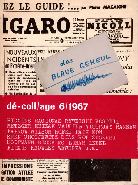 dé-coll/age 6. Bulletin der Fluxus und Happening Avantgarde, herausgegeben von Wolf Vostell. No. 6, Juli 1967. 1. Auflage. Frankfurt. Typos Verlag. 1967. 29 x 22 cm. 95 unpaginierte Bl. OKarton mit Klammerheftung, Bauchbinde. Minimale Gebrauchspuren. Die Bauchbinde etwqas eingerissen und leicht berieben, mit altem Tesastreifen verso verschlossen. Gutes bis sehr gutes Exemplar. Vorletzte Nummer des legendären Fluxus-Periodikums. Enthält Wiedergaben von Werken, Fotos und Aktionen von Al Hansen, Wolf Vostell, Daniel Spoerri, Stefan Wewerka, Diter Rot, Jean Tinguely, Alan Kaprow, Dick Higgins, Bernhard Höke sowie Texte von Franz Mon, Peter O. Chotjewitz, Ben Vautier und anderen. Lose beiliegende die Karte „das BLAUE GEHEUL“ von Diter Rot in dessen Handschrift als Original sowie die Bauchbinde in Lila. [Vgl. Sammlung Andersch, S. 117, S. 158].
