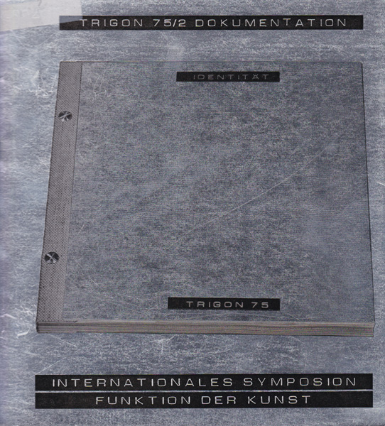 Fenz, Werner [Herausgeber]: Trigon 75.2. Dokumentation. Internationales Symposium Funktion der Kunst. Erste Auflage. Graz. Künstlerhaus/ Neue Galerie am Landesmuseum Joannneum. 1975. 24 x 23 cm. 134 unpaginierte S. Illustrierte OBroschur. Einbandkanten mit kleinen Bereibungen, Reste von Klebeschild auf dem Vorderdeckel. Sonst gutes Exemplar. Teil 2 des Kataloges zum Steirischen Herbst 1975 als Dokumentation zur Dreiländerbiennale zwischen Österreich, Italien und Jugoslawien. Teilnehmende Künstler waren u.a. Giulio Paolini, Michelangelo Pistoletto, Miroslav Sutej, Maria Lassnig, Peter Weblel und Gerhard Rühm. Durchgehend mit Abbildungen versehen. Text in deutscher, englischer, französischer und italienischer Sprache.