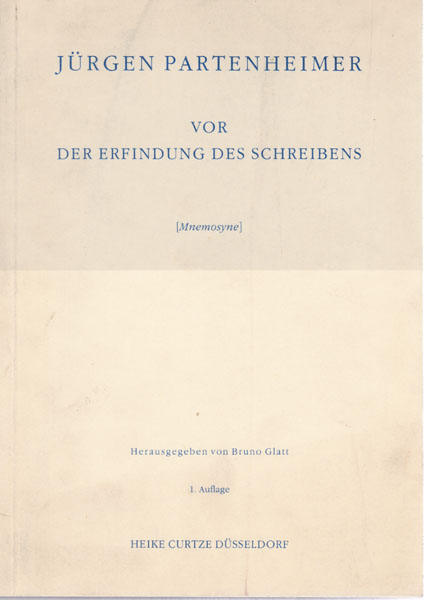Partenheimer, Jürgen: Vor der Erfindung des Schreibens. Handzeichnungen mit einem Text von Bruno Glatt. Auflage: 500 Exemplare. Düsseldorf. Galerie Heike Curtze. 1986. 24 x 17 cm. 28 S., 2 Blatt, Beilage. OKarton. Umschlag gering angestaubt. Gutes Exemplar. Enthält 10 farbige Werkabbildungen